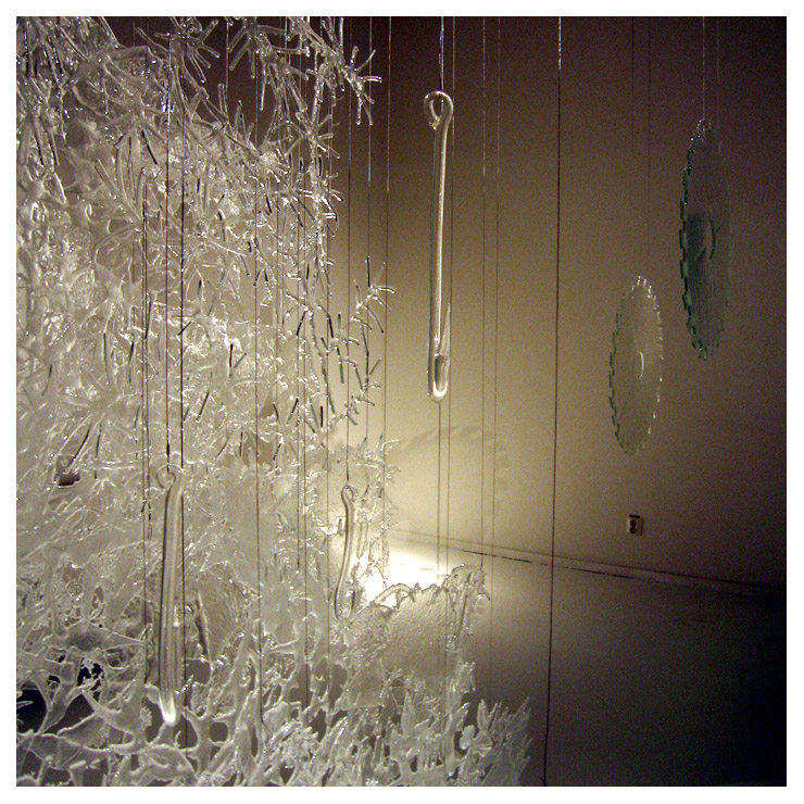 Vi gick snabbt vidare till Ingalena Klenells häftiga utställning Borderland. "Om inre och yttre landskap, dess gränser, identitet och makt." Man kan väl kalla det för en glasinstallation. Eller glasscenografi. Personen som hade ljussatt utställningen hade lyckats mycket bra. Däremot så behöver museet göra nått åt dom fula elementen...